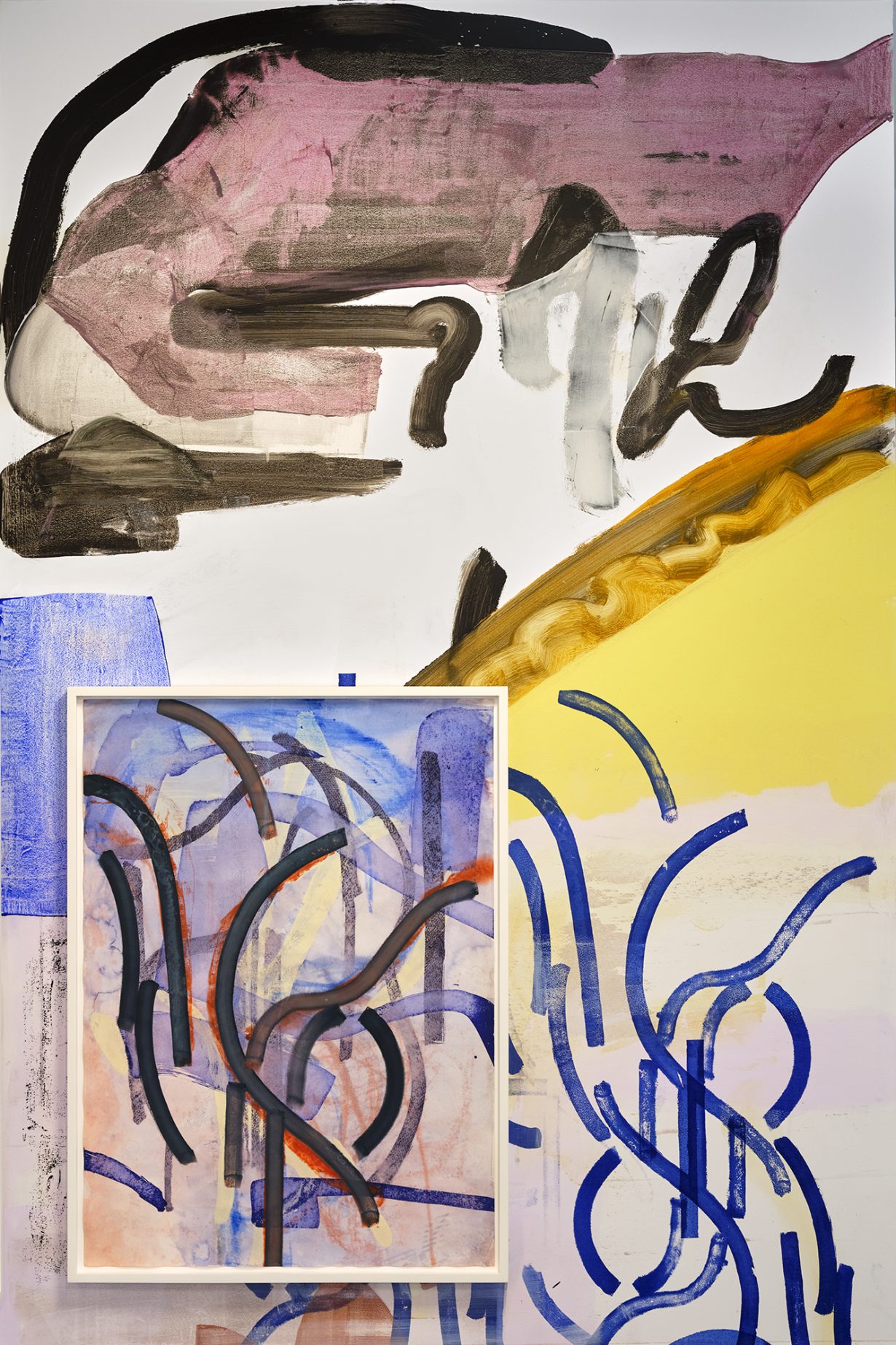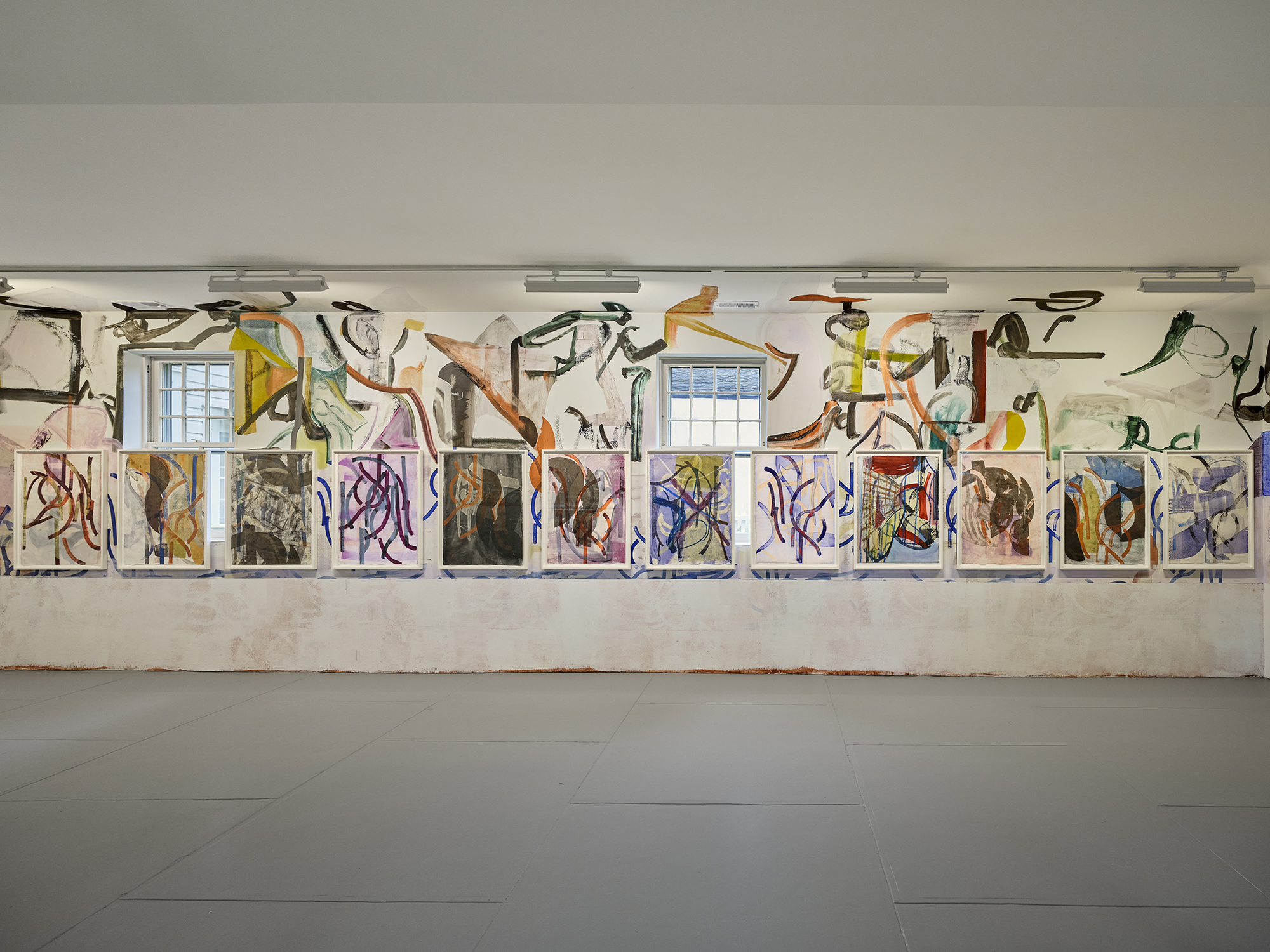 Alternate Side (Permutations #1–32) is conceived as one site-specific installation, consisting of a series of 32 framed and untitled monotypes, hung on gallery walls that are themselves host to improvised painting and screenprinting. The monotypes, which offer an interplay between image and asemic writing, deploy a small pool of forms, ranging from vertical, slightly zigzagging lines of various lengths and thickness to ovals of different sizes. In one, lines of burgundy and storm-cloud grey wiggle against a light pink backdrop. Another is filled with whirling bands of Persian blue and black. Sillman couples and decouples these shapes against hazy colour fields and seems to revel in her own mark-making processes, laying bare traces of production.