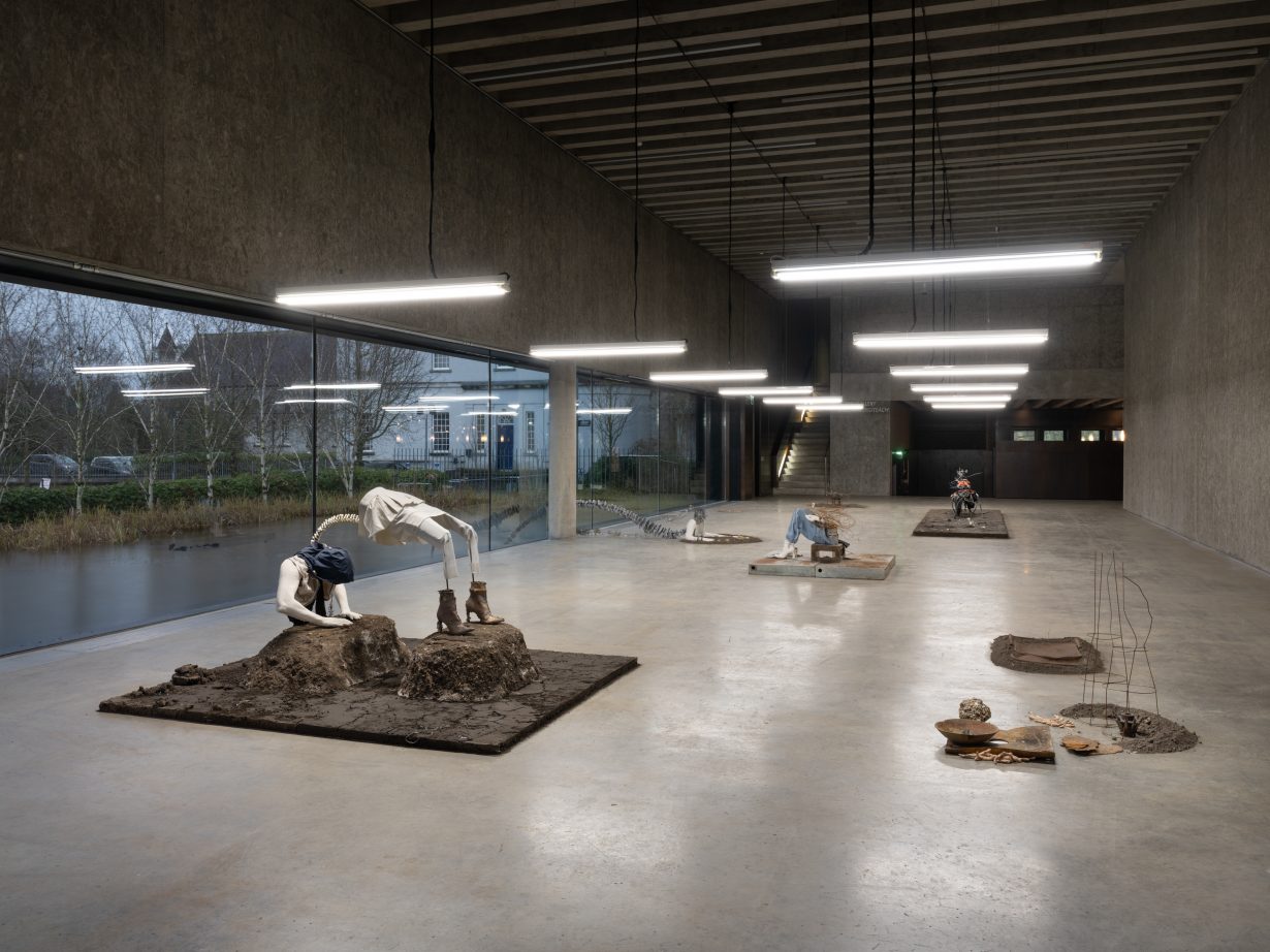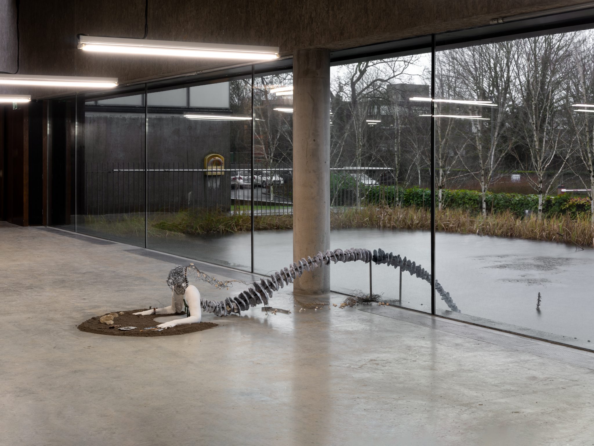 The forlorn spirit of Anne Hardy’s Interloper – a suite of floor-based installations and assemblage sculptures, spread across two adjoining galleries at Visual – feels well-matched to my late-winter state of mind and body. The British artist’s rough-wrought amalgams of cast, found and crafted objects comprise much that looks bent out of shape or barely held together. Most of the sculptures, whether resting on muddy foundations or otherwise accessorised with earthy detritus, present as twisted or partial humanoid entities. Some of the materials they are made up of – rusted wire, crushed tin cans – accentuate age and deterioration, wear-and-tear. Two of the pieces sit on low cuboid plinths shaped from compacted topsoil: brittle, crumbling supports, their flaked, pitted surfaces a mosaic of multiplying cracks. They are envisaged, so their titles declare, as life-size ‘Beings’, each one identified with a different attribute or association. Some, like Being (Contortionist) (2025–26) and Being (Interloper) (2026) stretch or kneel, as if performing yoga poses or prayer rituals – perhaps striving, against the odds, to improve or centre the self.