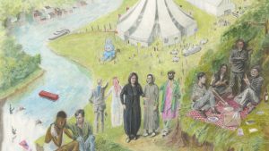 During opening week, Weerasethakul stressed that this impressionistic piece was, on one level, an elegiac farewell to saak (remnants, carcasses) or bygone expressions – spiritual, ecological, architectural, artistic, textual – in the region where he grew up. The pulpy backdrop of a royal throne hall on the back wall, in which pillars frame a red carpet, is the kind used by mor lam theatre troupes. The playful dramatic style, wherein the narrator gamely voices all characters, belongs to obsolete old-school radio dramas and cinema dubbing. The images of the cinema evoke his childhood memories of being enthralled by 16mm Thai dramas and Steven Spielberg spectacles. And the footage of the Mekong is a continuation of his decade-long interest in documenting its changes, particularly in light of the Chinese dams now upstream.
