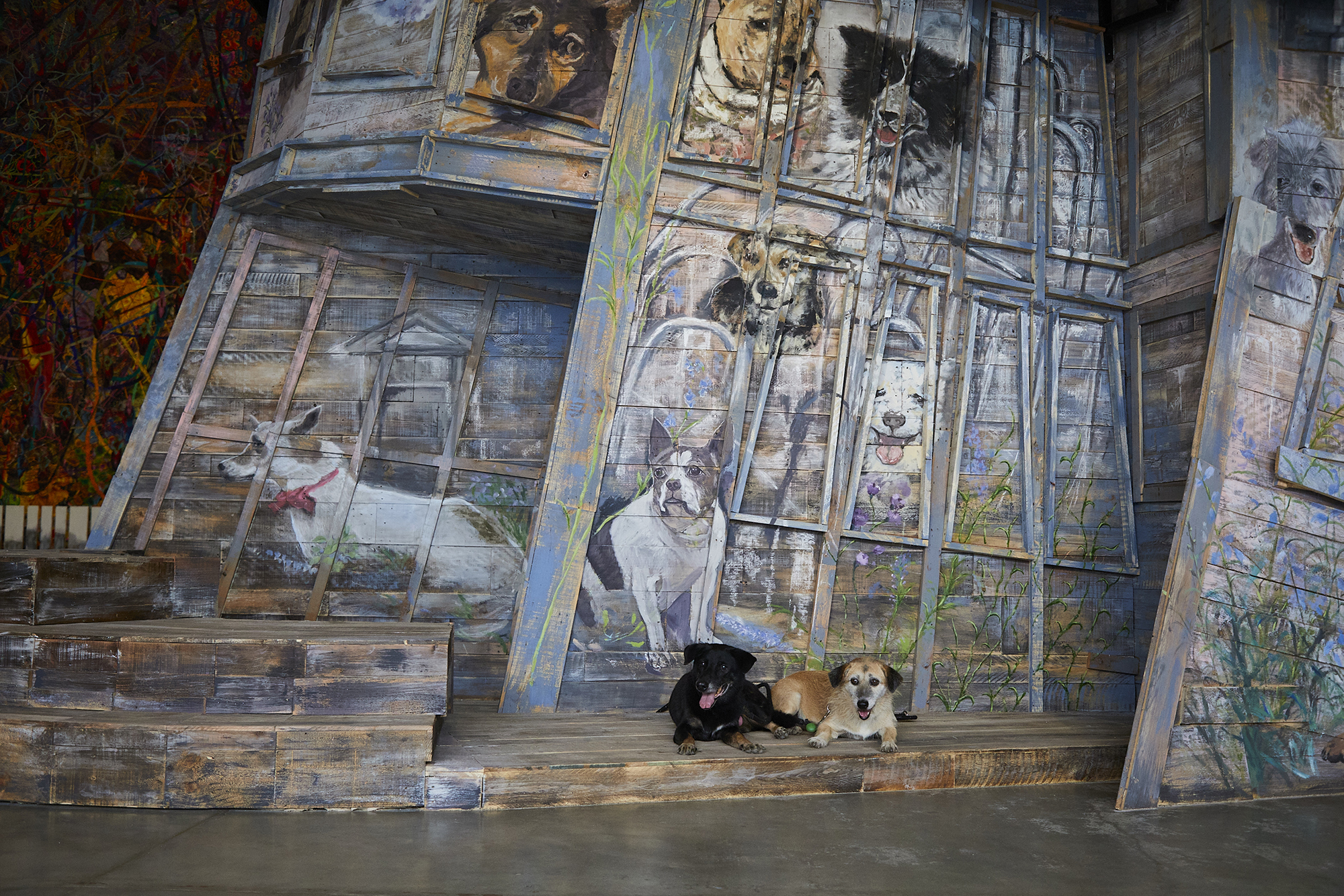 Araya Rasdjarmrearnsook, Ban Wang Hma (Dogs’ Palatial Castle), 2025, metal, wood, acrylic, paint, 1100 × 732 × 549 cm. Courtesy the artist