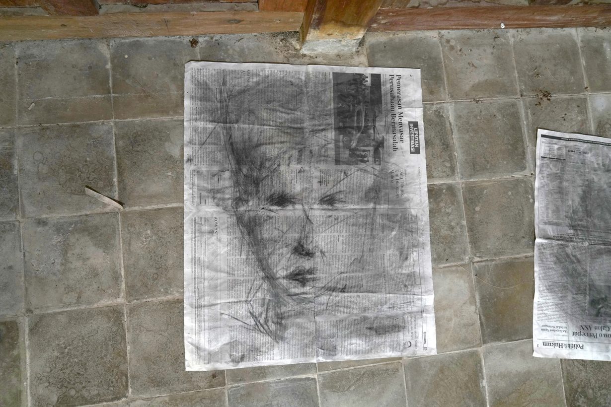 Counterintuitively, this edition of the biennale also feels strangely ahistorical and apolitical. Often, its focus on larger epistemic shifts overshadows ongoing and specific injustices. Some of the artworks here urge deeper changes in how we order and understand the world, while tackling local exigencies and material realities, opening up a richer seam of meaning. A highlight is Imal Malabar’s ghostly installation Menggali Cerita Lewat Garis (2025), comprising charcoal drawings of people mounted or scattered around a room at the Bibis Monument. An important venue in Indonesia’s struggle for independence against the Dutch, one room in the building is purportedly a spiritually charged place where presidential hopefuls came to meditate to gain power. Malabar’s hasty, smudged sketches have an automatic and grotesque quality – as if they bloomed like fungus out of walls in a damp room. The faces include known ones, such as General Sudirman, national anticolonial hero and the first commander of the Indonesian National Armed Force, as well as other unidentified persons. Malabar’s artist bio states he is part of the Alliance of Independent Journalists in Gorontalo, advocating for press freedom and protection from intimidation; these mysterious faces could also be interpreted as those of victims of such violence and disappearance. Politically engaged and exuding a dark occult energy, the work gathers politics, black magic, histories of struggle and subjugation, and the teeming presences of unknown beings. It taps into different realms without losing sight of this flawed and familiar one.