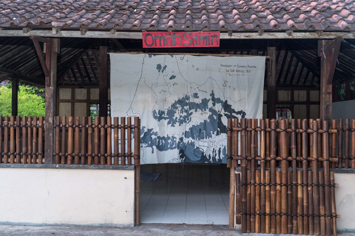 Overall, though, despite moments of insight and illumination, the biennale feels tired. Given the global decolonial turn in challenging Eurocentric paradigms (systemic thinking, instrumental rationality, etc), the concept of kawruh is not exactly radical. Instead, it sits dutifully within well-worn, mainstream curatorial currents exploring different modes of sensemaking (embodied knowledge, Indigenous cosmologies and so on), but doesn’t offer many fresh openings. Arahmaiani’s longrunning Flag Project (2006–) gets a conscientious local iteration with KWT Sawit, a local female farmers’ group whose performanceincorporates flags inscribed with Javanese words such as bejo (fortunate), adem ayem (peaceful) and rahayu (well-being). Some research-heavy projects exploring ‘worthy’ topics struggle to be engaging experiences. Kolektif Arungkala’s installation Omah Samin (2025) centres on the Samin tribe, an Indigenous group known for its resistance to Dutch colonial forces. More like a reading corner than an artwork, it is filled with newspaper reports blown up to poster size, scans of academic articles placed around a table, as well as a large map showing the geographical distribution of the Samin population.