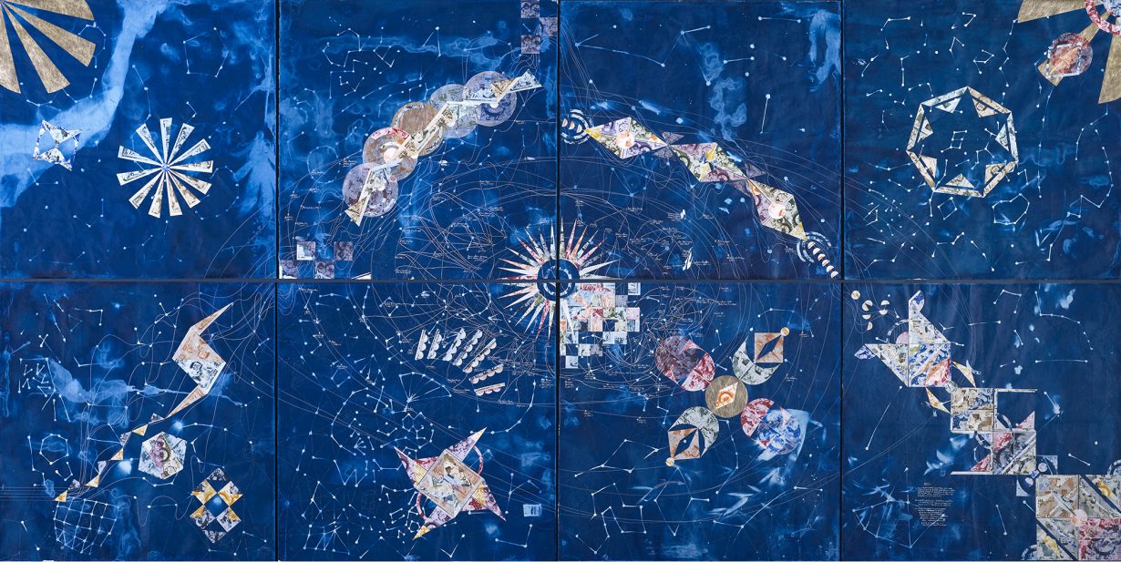 Two works currently on show seem to ward off these dangers, as they stake out a broader range of concerns and sympathies. As It Is: Nothing Lasts Forever (2025) is a collage of intaglio and cyanotype prints, measuring four-and-a-half metres in length, that evokes and comments indirectly upon the awe of the unfathomable. From a distance, we see a deep blue, heliocentric solar system wherein geometric shapes excitedly orbit a many-pointed sun. But on closer inspection it is a cartographic representation of market forces its dots denote corporations as well as ‘living beings’ and ‘minerals/ natural resources’ traded ‘as commodities in the open market since the sixteenth century’, the succinct legend states, while its lines (which create a web of connections between entities) signify a ‘clearly documented extractive relationship’. Created for a group show about the persisting global legacy of the plantation system (The Plantation Plot at Ilham Gallery, Kuala Lumpur), it is a piece that induces dual sensations: disorientation and wonder. It gains its air of mystique and infinitude through an esoteric visual language grounded in Zheng’s expansive realm of interests: theosophic abstract art, Ancient Chinese star maps, a fascination with the rhetoric of capital that was triggered by a shortlived job in financial services. “I wanted this map of capitalism to feel astronomic and almost spiritual,” she says, “because that is the way finance and the market is spoken of in neoliberal countries. I strongly believe that the United States is a theocracy and its god is capital.”