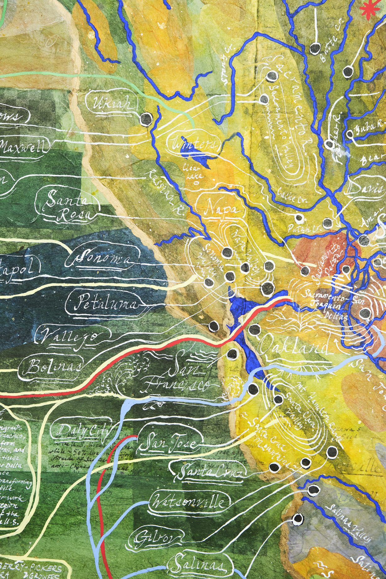 Measuring almost three metres wide, this mixed-media map on rice paper fuses palimpsestic, semiabstract mark-making with a surfeit of handwritten annotations. Across its layered surface, factoids about the contributions of East Asian, South Asian and Southeast Asian farmworkers to California’s agricultural development – each enclosed in a speech bubble and plotted to a location and ethnic group via a colour-coded legend – are joined by the innocent impressionism of the backdrop’s farmland vista and crude clouds, as well as a disclaimer. This map is ‘nowhere near exhaustive’ and ‘admittedly incomplete’, Zheng explains in fine handwriting, nor does she ‘mean to elide or ignore the massive contributions of Latinx- and Chicanx-Americans’, who ‘form the backbone of the farm industry in the Golden State’.
