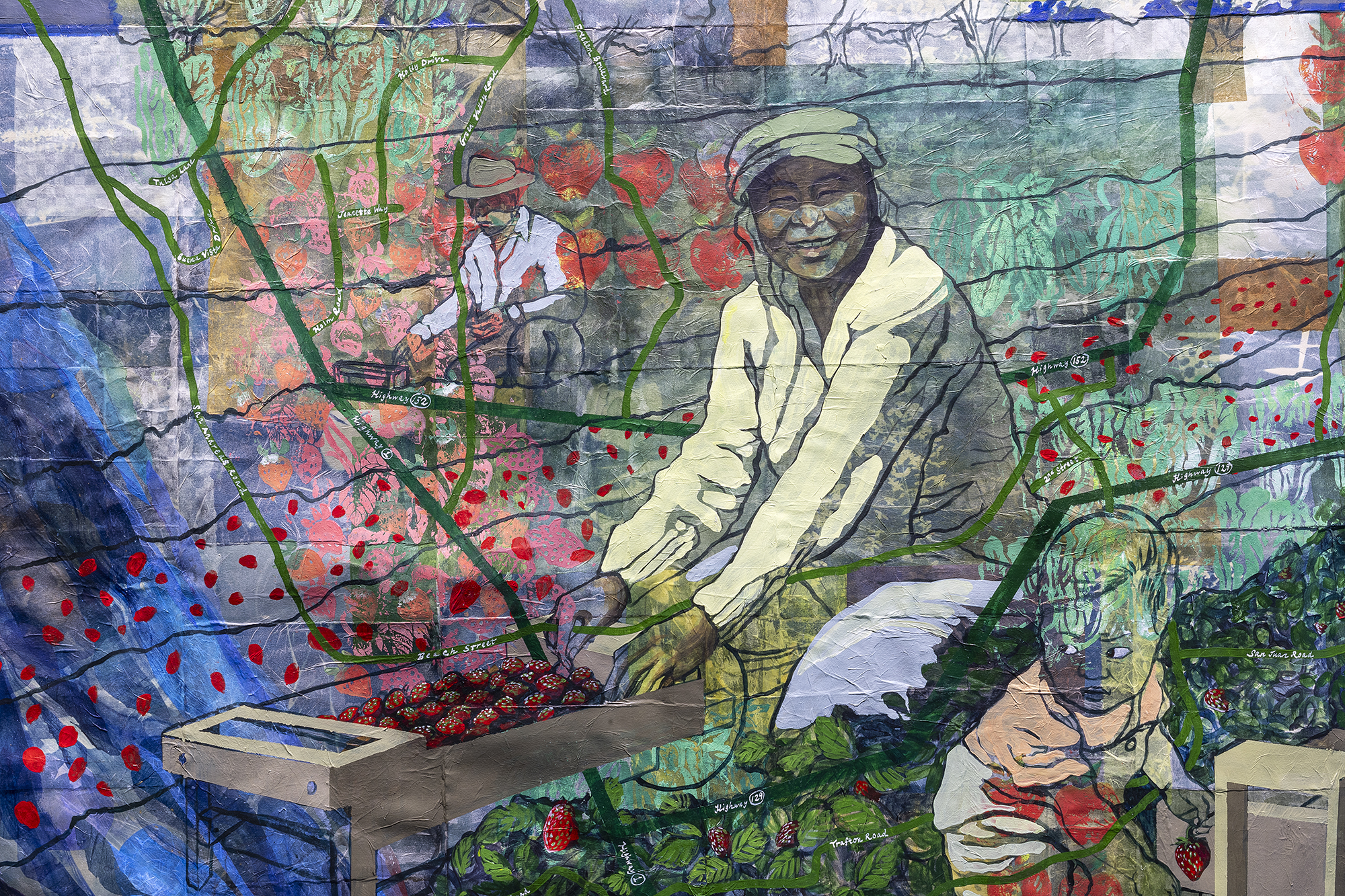 But while the tone of her notes for reading this map is circumspect, even apologetic, her anecdotes are forthright. These serve to trace both the trajectory of Asian immigrants in California’s farming industry since the late 1800s – their ascent ‘from being field hands into the landowner class’, their travails in the face of ‘intensifying white resentment’ and more general suspicion of Asian others during the Second World War, their alchemical transformation of barren land into success stories – and this trajectory’s overlap with us labour history. While researching the piece, Zheng tells me, she found that “many of the biggest organised labour actions and farm strikes in California were actually led by Asian workers” – a discovery that complicates the “mainstream normalised narrative of Asian workers as invisible, as silent, as deeply marginalised”. Her map of California plots this secondary narrative with the same alacrity as it does the first. ‘Starting in the 1930s, white growers began to fear Filipino workers,’ begins one caption.