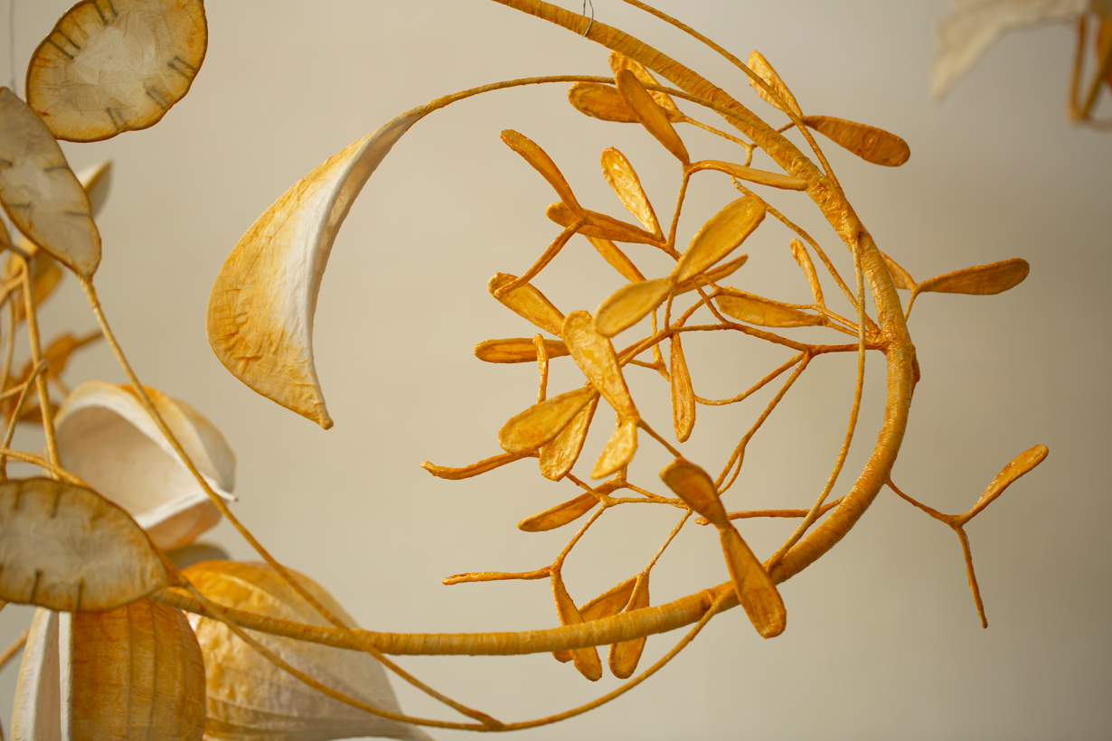 In the installation, multiple elements are suspended and placed in relation to one another, creating a kind of choreography. The forms are developed in response to the space they inhabit and to the shifting effects of light and shadow across their surfaces. The final composition is resolved in space through a process of improvisation and adjustment, before arriving at a cohesive whole and a sense of visual harmony.