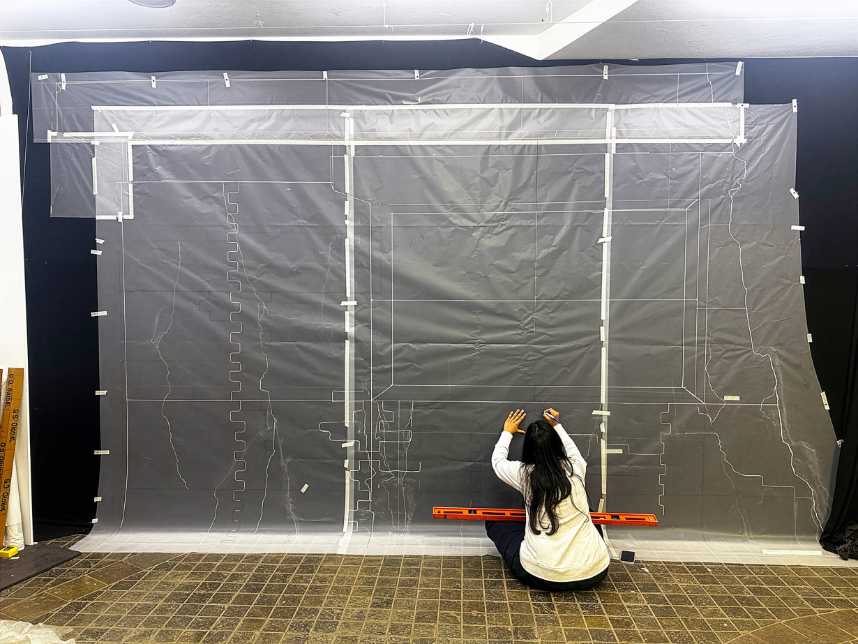 SS It has been months of intense work, including many 14-hour days, quite a few of them spent on top of a ladder. The process has been physically, emotionally and mentally rigorous. Each day involves moving constantly between different kinds of making: drawing life-sized images that will later become embroidery, working on digital sketches, building physical models, preparing full-scale drawings for the welders, working with thread, soaking and dissolving large, heavy textiles, and slowly assembling the installation.