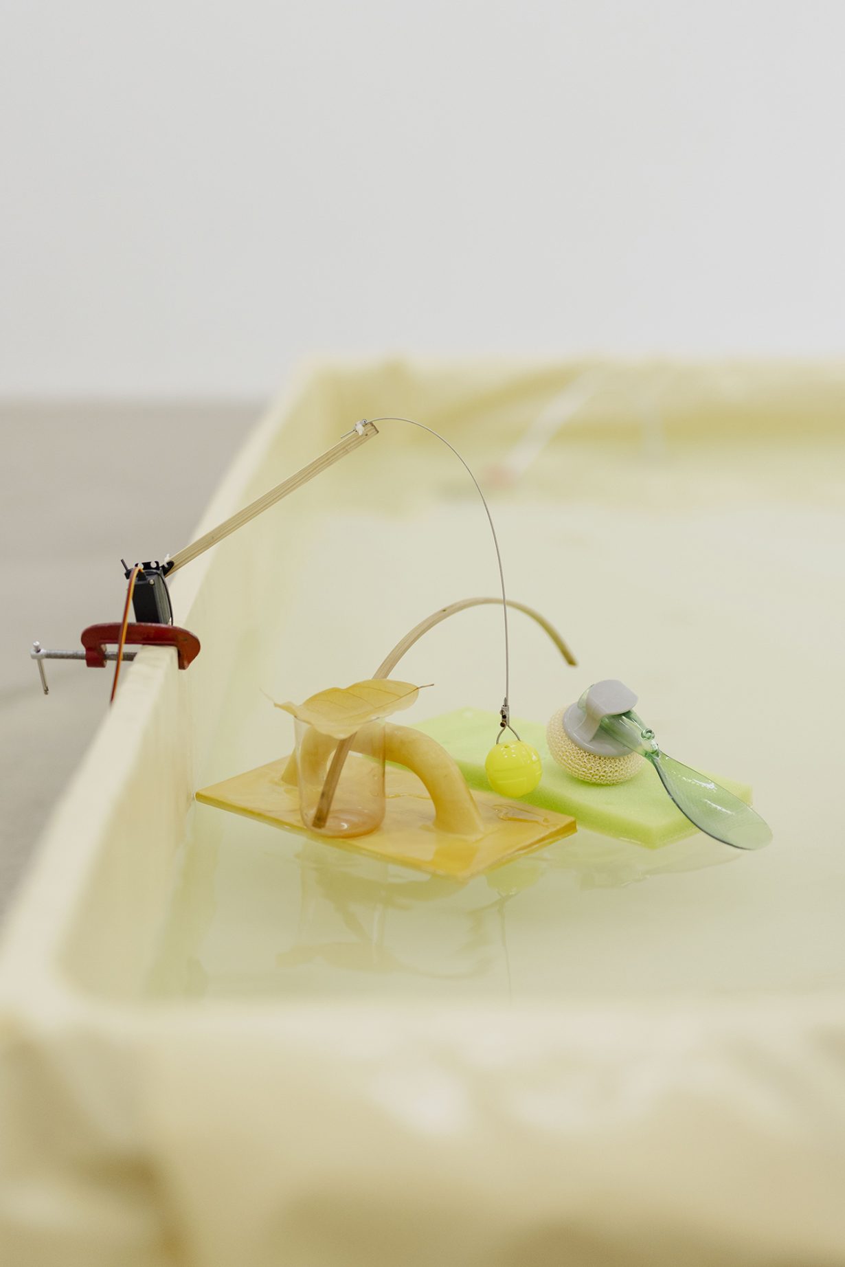 If, seen on their own, Leong’s small sculptures generate quirky but pleasing harmonies, for her largest installation, The sensation of floating (2025), she creates more complex music by sending many little assemblages drifting around a shallow three-by-three-metre pool. These ‘rafts’ are constructed from humble disposable materials: sponges, rectangular plastic paint-palettes, rolled-up foam wrapping, with a plastic spoon as an oar and an egg as a passenger, and so on. The work exudes a scrappy and DIY energy, and the movement of these lightweight, makeshift arrangements – wandering aimlessly within a little jail – both charmed and saddened me at the same time.