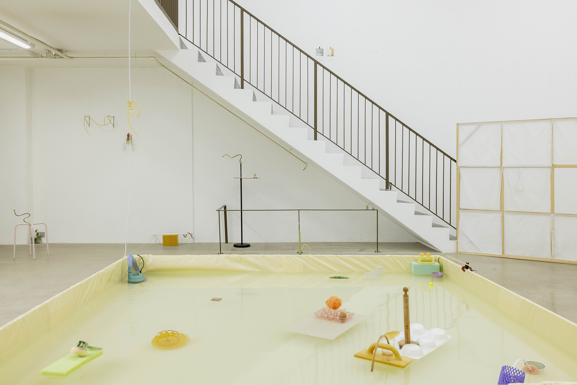 If, seen on their own, Leong’s small sculptures generate quirky but pleasing harmonies, for her largest installation, The sensation of floating (2025), she creates more complex music by sending many little assemblages drifting around a shallow three-by-three-metre pool. These ‘rafts’ are constructed from humble disposable materials: sponges, rectangular plastic paint-palettes, rolled-up foam wrapping, with a plastic spoon as an oar and an egg as a passenger, and so on. The work exudes a scrappy and DIY energy, and the movement of these lightweight, makeshift arrangements – wandering aimlessly within a little jail – both charmed and saddened me at the same time.