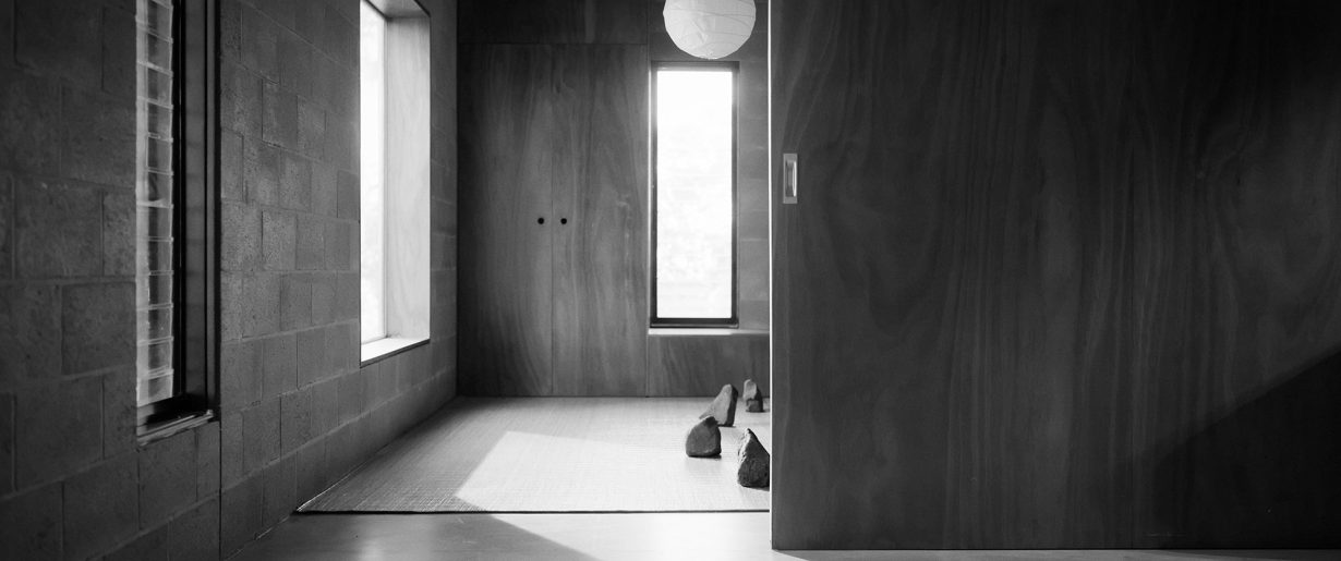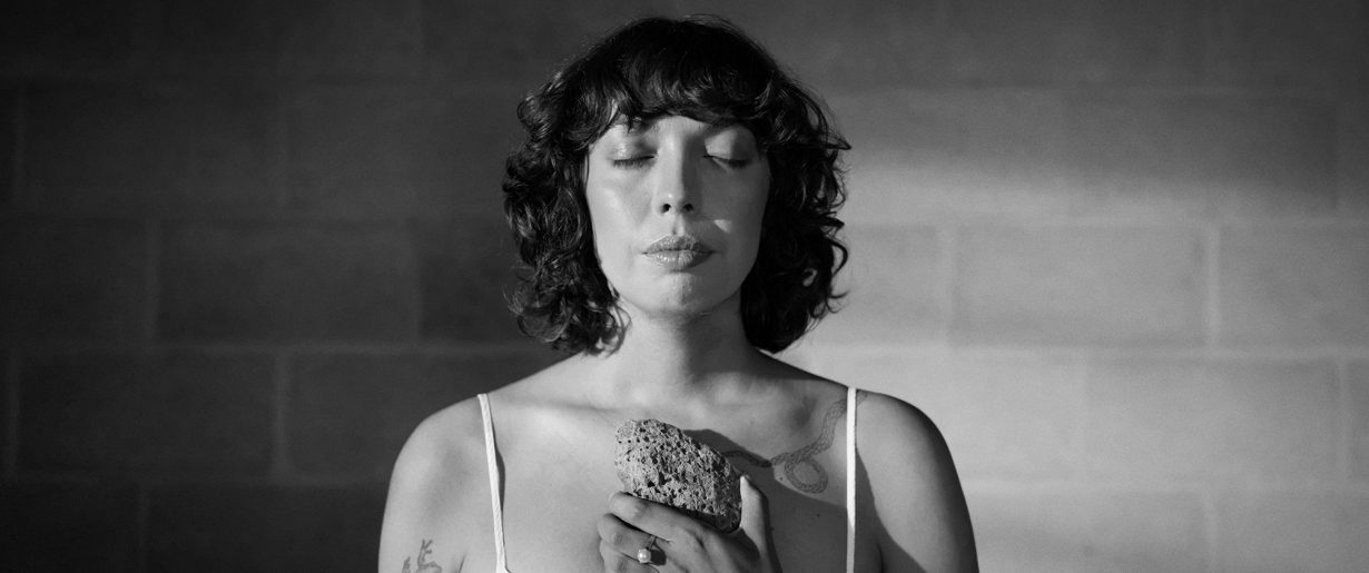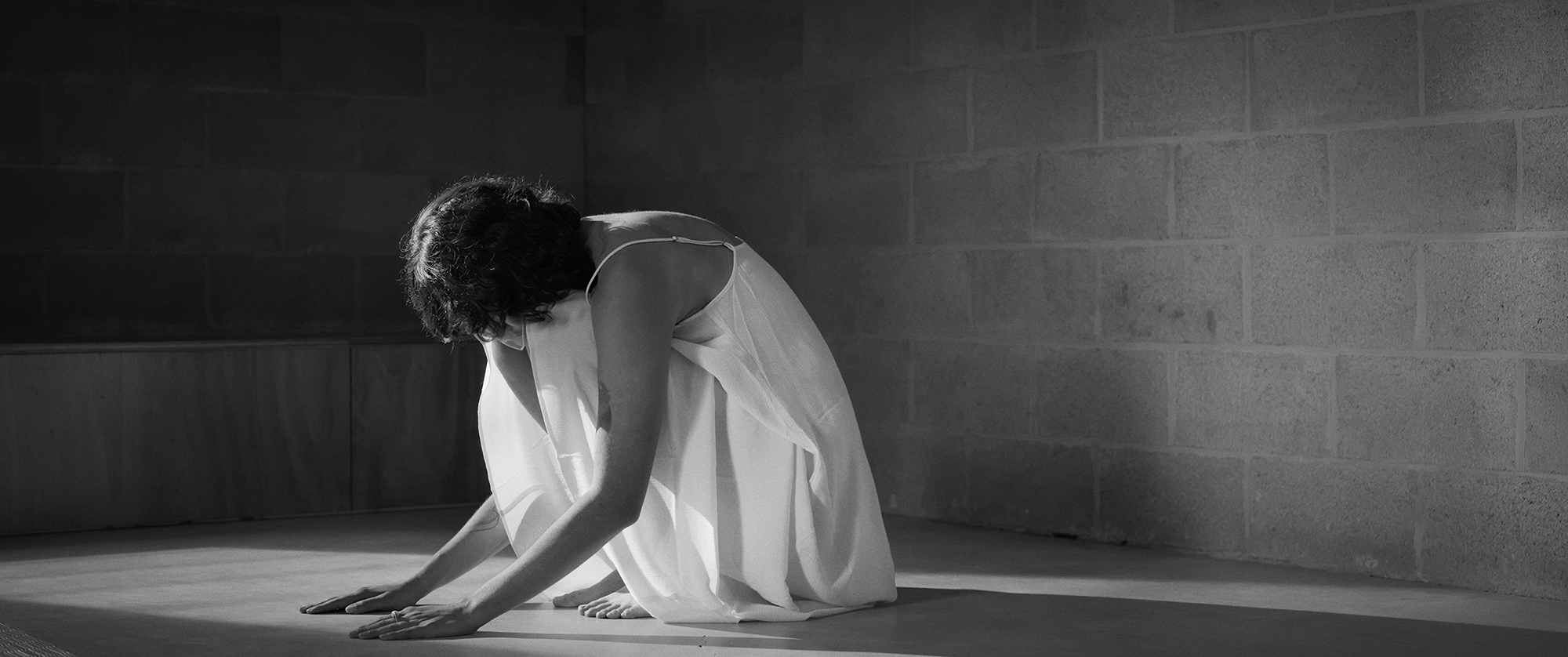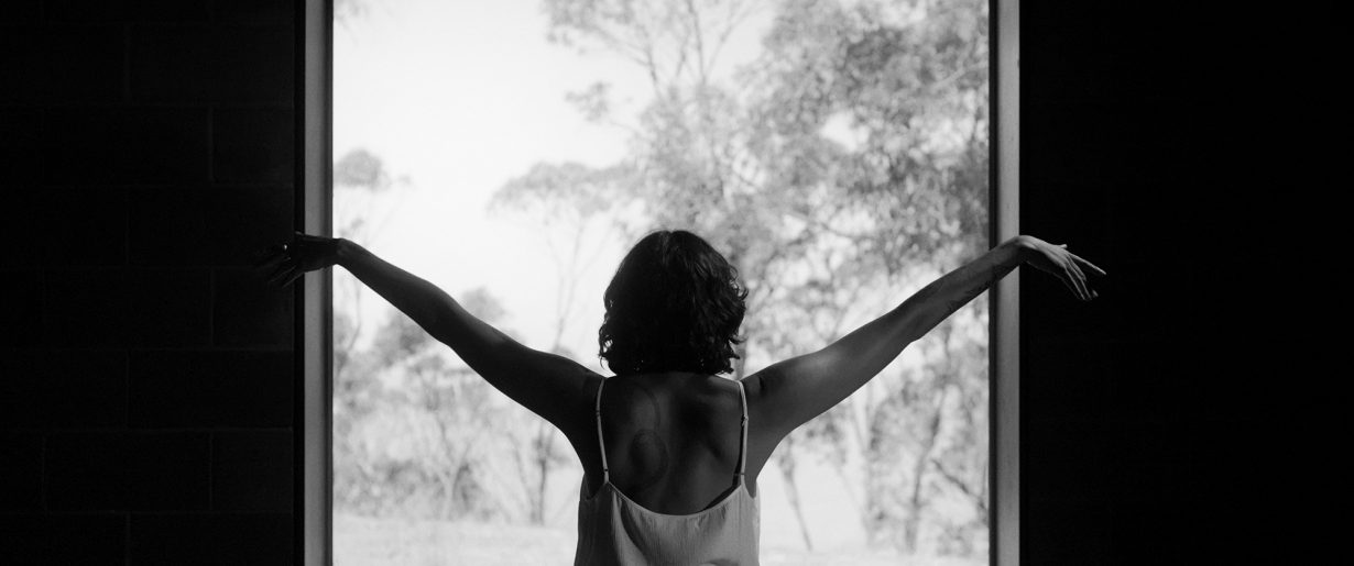 In Eternity the Butterfly, the everyday potency of female Indigenous interconnectedness takes a powerful, contemporary form. The work unfolds through two viewpoints inside a cinder block home that flicker back and forth: from one perspective, a fixed partial view of an empty room; from the other, a view of Eternity, the lithe, luminous female figure, who somehow appears both earthly and ethereal, light and dreamlike. In the first few flickers between viewpoints, I notice little: Eternity makes clear, deliberate stretching movements in front of a large window, while in the stark room a formation of small rocks appear in a line on the floor. Gradually, Eternity’s movements begin to interlink, a rhythmic pace emerging, and with each shift of viewpoint the rocks seem to grow; first slowly, as though summoned by her all-encompassing, guttural vibration, then transforming into black fabric forms and eventually swelling into looming dark monuments.