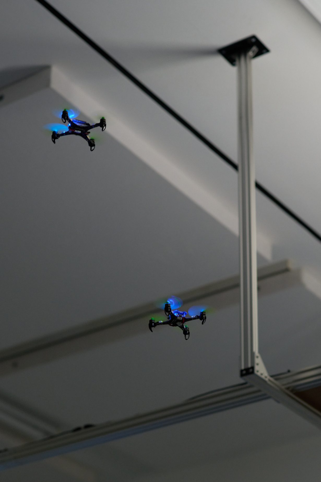 Automated Fantasy Procedure doesn’t lack for incident. A squadron of small research drones hovers menacingly above the visitor’s head, executing a choreographed performance. Two screens mounted on aluminium frames display a two-channel video in which a host of fictional human archetypes stalk loaded, real-life sites, or pop up in green-screen on a 3D-printed set designed to resemble a data farm; they even perform a dance routine to a retro indie-pop number. Propped up against a wall is a Roman-style mosaic depicting two intertwined human figures – a nod back to an ancient craft intended as a counterweight to the digital components elsewhere. All this is experienced within the course of scheduled ten-minute replays, and if it feels like too much, too quickly – that may well be the point. The installation aspires to the sensation of smartphone scrolling, or to a hyperactive manifestation of a deficient attention span.