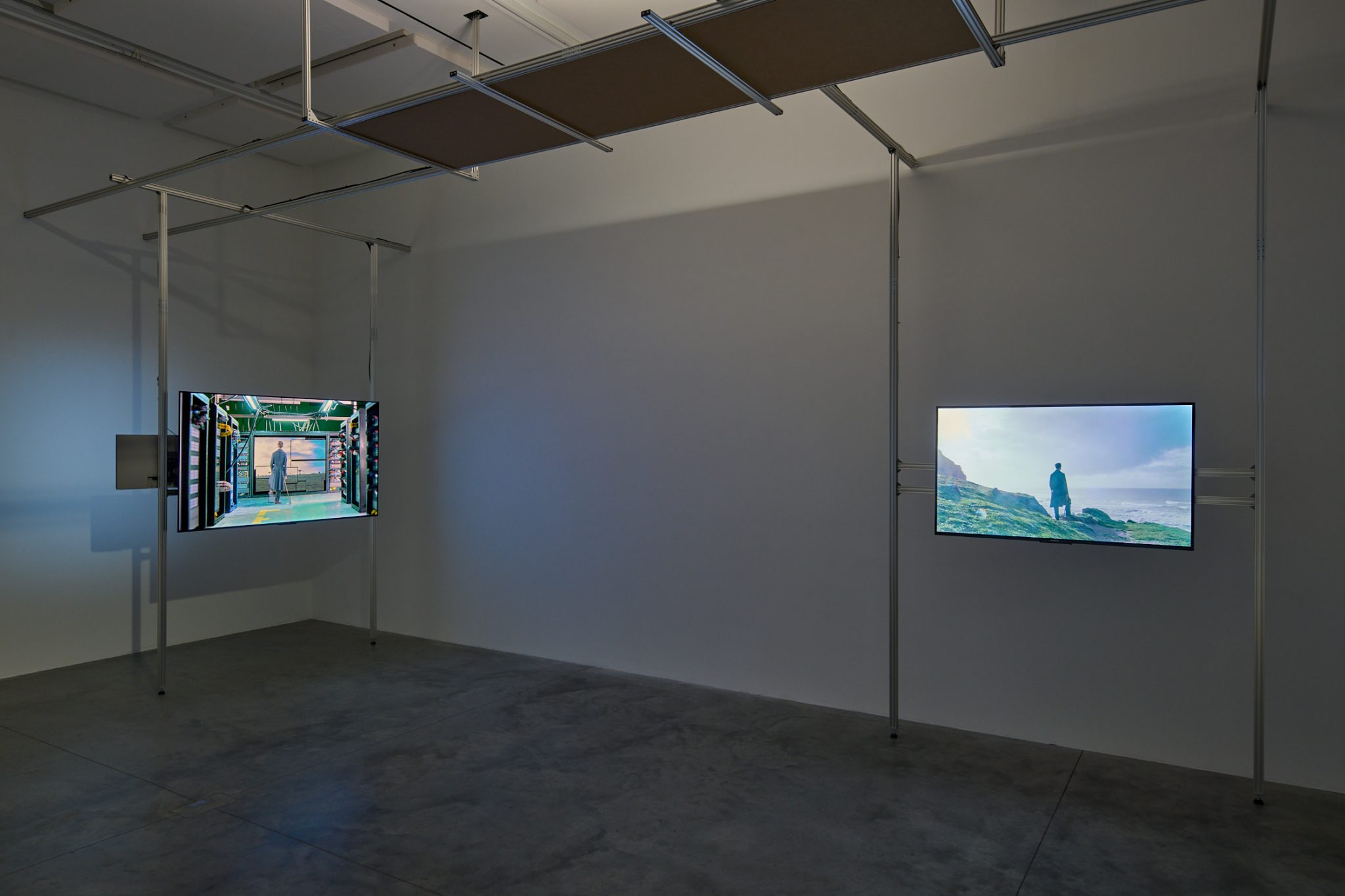 Much of the video was filmed within the gallery itself, throwing a disorienting mise en abyme into the mix. The actors playing Moss’s characters – a ‘horror’ figure in a grotesque fright mask, a windswept Romantic based on Caspar David Friedrich’s Wanderer above the Sea of Fog  (1818) – pace its floorspace, at times filmed from above by the drones whining away overhead. Other scenes were shot on location: in sight of the vast satellite dishes of a GCHQ listening station; on a beach beneath which, the exhibition notes tells us, data cables connect the UK mainland to the global network; on a wind farm subjected to an assault from a moustachioed Don Quixote stand-in. It amounts to an indiscriminate melting of fictional registers; of the past with the present; of technological systems with the infrastructure that facilitates them.
