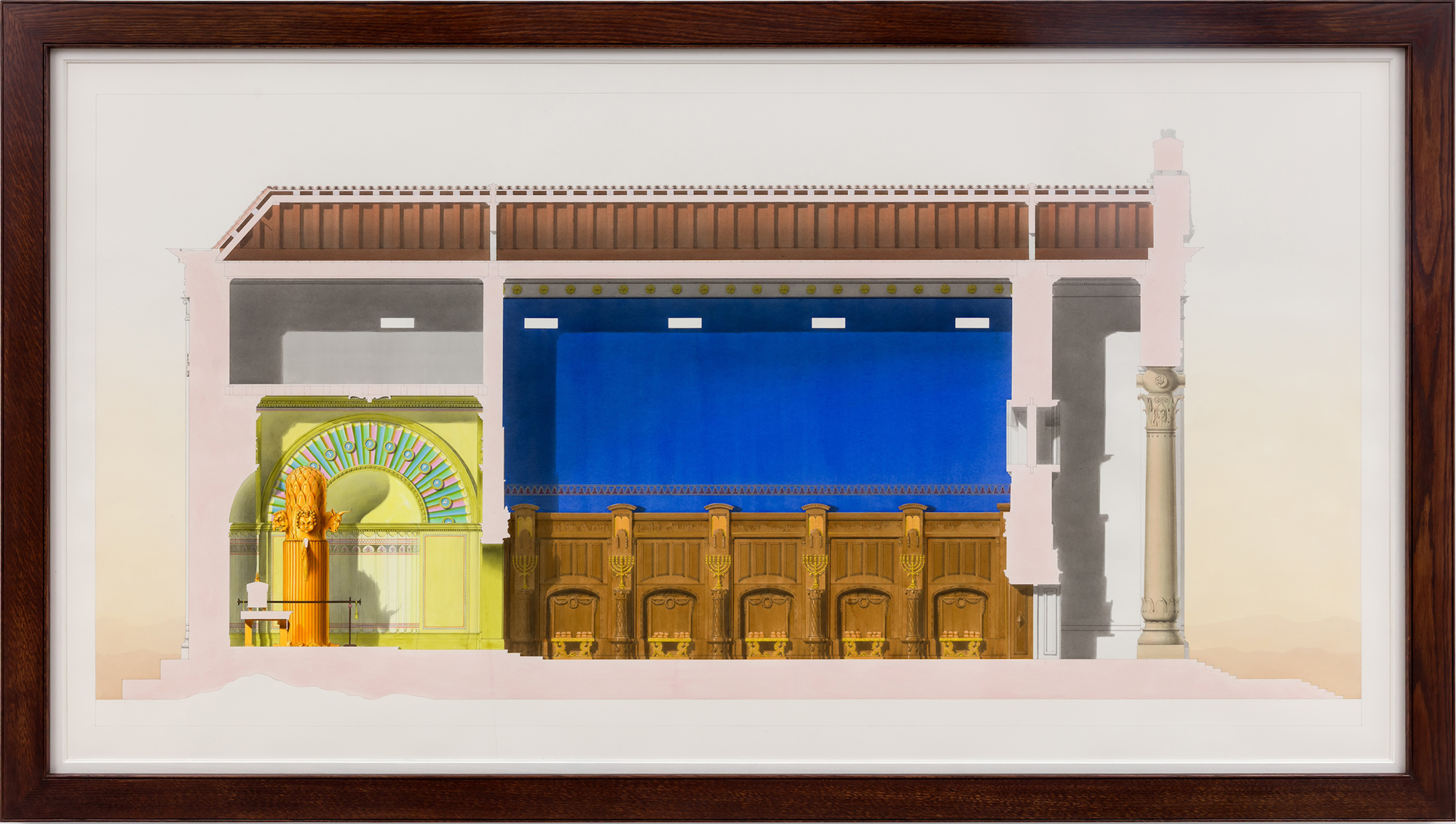 Pablo Bronstein, Temple of Solomon Second Version: Cross-section, 2025, acrylic on paper, 126 × 216 × 6 cm. © the artist. Courtesy the artist and Herald St, London