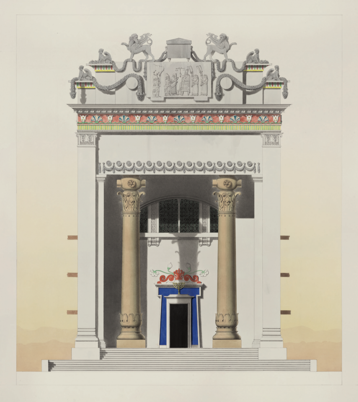 Pablo Bronstein’s project at Waddesdon Manor is a case in point. In the first instance it’s a proposition that operates within the artist’s longtime fascination with historical architectural style, fed through the artist’s trademark ironic, anachronistic fiction-making. Bronstein’s 2008 book A Guide to Postmodern Architecture in London – in which 1980s postmodernist buildings were catalogued and rendered like etchings in some eighteenth-century architectural almanac, and in which postmodernism’s callbacks to neoclassicism were reimagined as if they were authentic products of the neoclassical period – is an enduring example of the artist’s approach. His 2017 book, Pseudo-Georgian London, similarly excavates the maligned contemporary style of ‘developer-led Georgian’; the histories of art, taste and class underlie Bronstein’s visual fabulations, often turning to the conclusion that cultural identity – battleground that it is – is always, in some way, an invention.