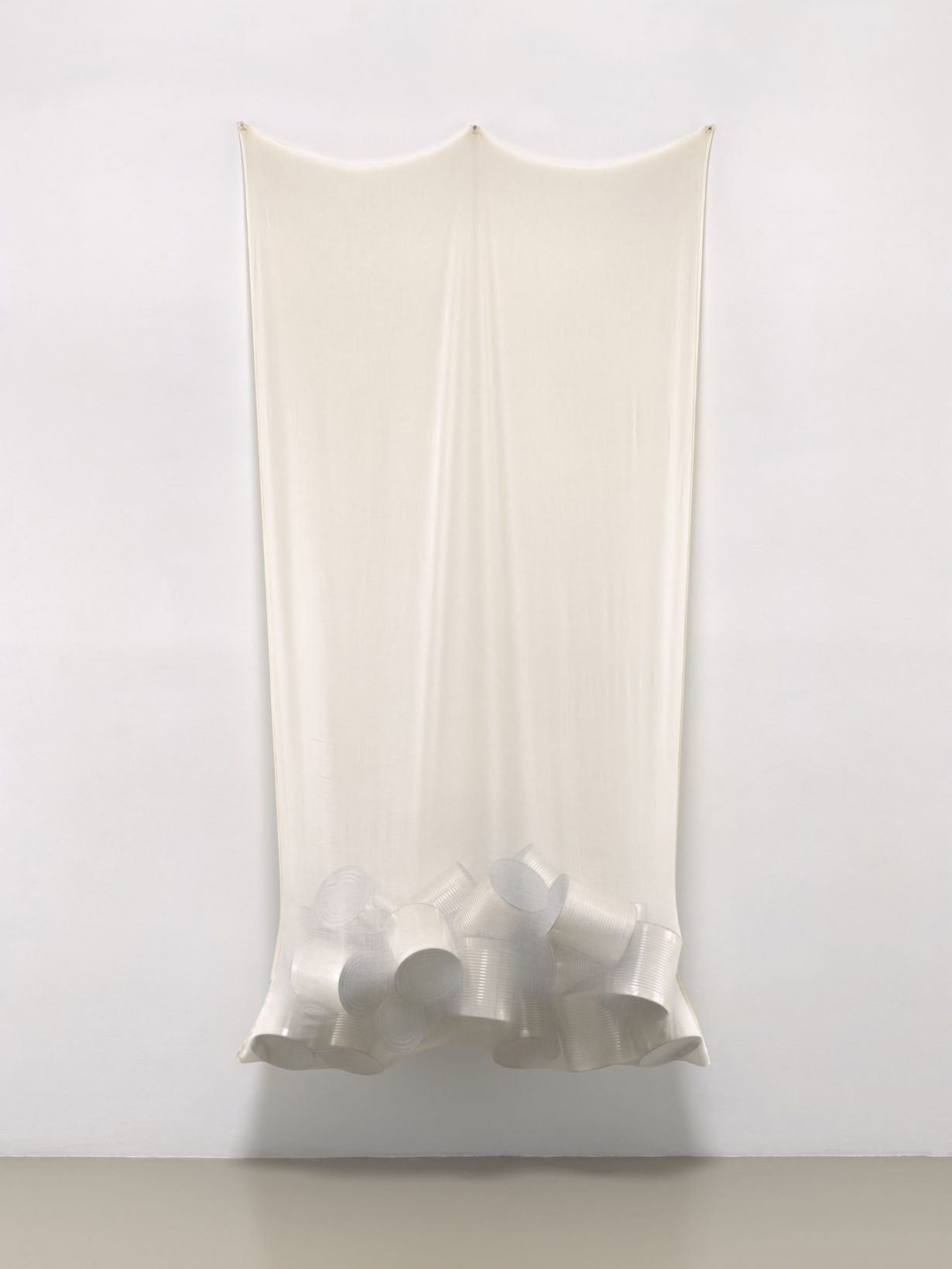 According to the catalogue, Rauschenberg wished for his fabric experiments of this period to ‘critique the “excesses” of imagery in modern life’ by way of reduction, in contrast to the accretive approach he took to making his celebrated ‘Combines’ (1954–64). Those formidable painted surfaces, bombarded with found objects like bedding, American flags and rubbish from the street, might be seen as ‘receptor surfaces’ (as critic Leo Steinberg described them), on which slews of ‘data’ have been entered. Rauschenberg’s move to foreground textiles tracks with his lifelong attempts to reinvent his visual grammar following his early career success. It also signalled his sensitivity to the material and processual concerns raised by contemporaries like Eva Hesse and Tina Girouard, some West Coast feminist artists such as Miriam Schapiro, and the work of the Arte Povera movement in Italy. What resulted were spare and fragile-looking structures erected in a plain style that reviewers from the 1970s onwards have criticised as barren, flimsy and confusing.