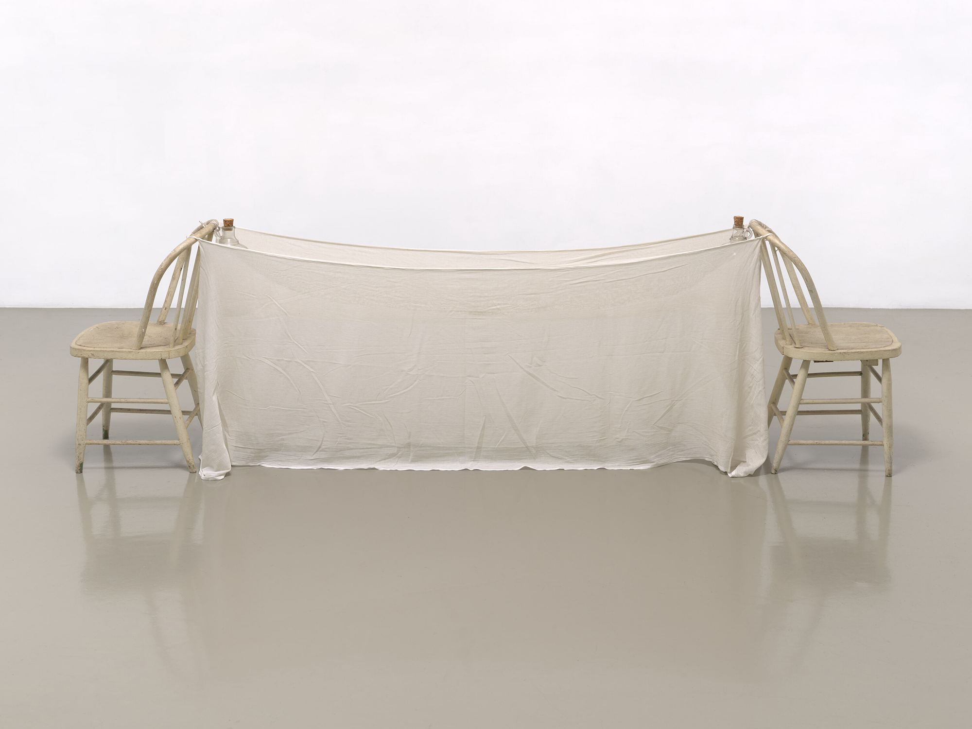 Robert Rauschenberg, Sant’Agnese (Venetian), 1973, mosquito net, wood chairs, shoelaces and corked glass jugs, 82 × 269 × 56 cm. Courtesy Robert Rauschenberg Foundation, New York