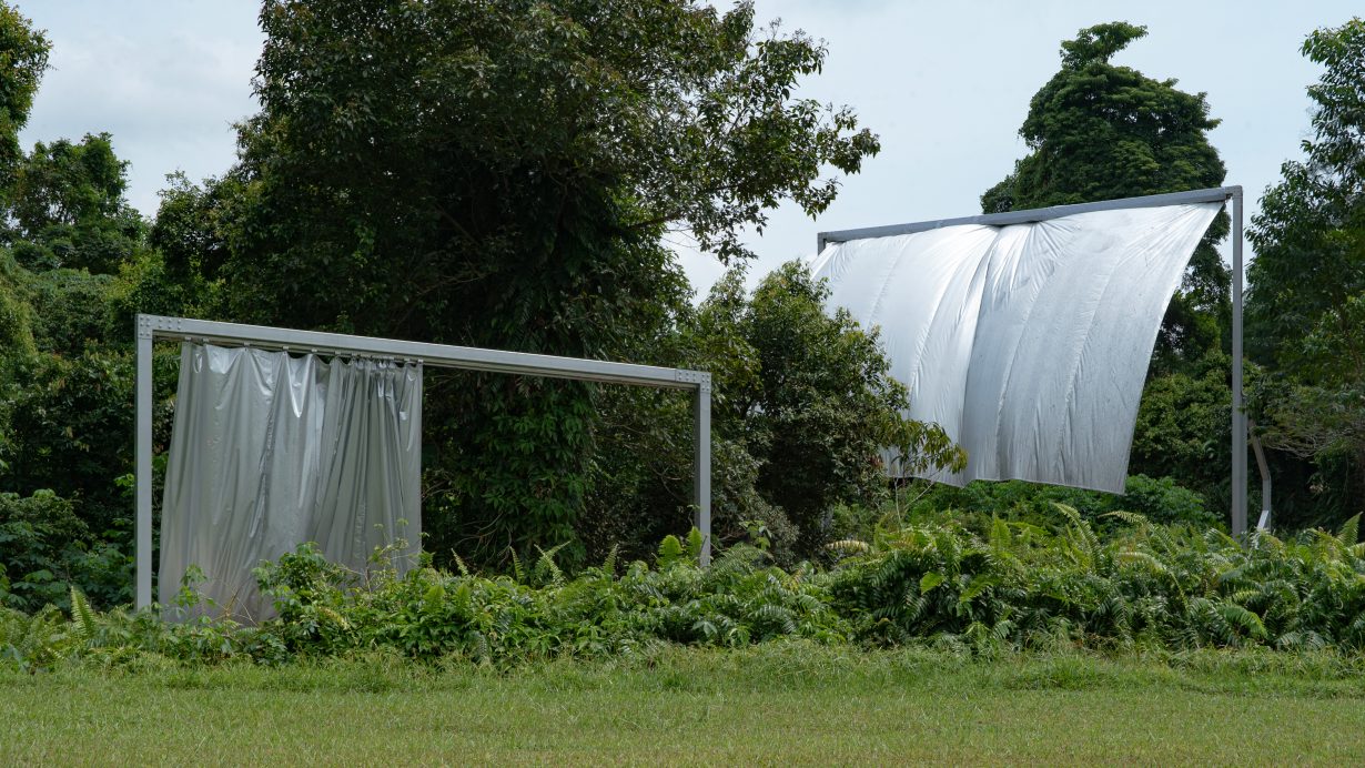 If you believe a wall text in the biennial’s most conventional venue – the Singapore Art Museum (SAM) – the curators of this biennial, Duncan Bass, Hsu Fang-Tze, Ong Puay Khim and Selene Yap, all of whom work at SAM, planned it this way. The intention behind pure intention is to undermine the truth in each of the title’s words: ‘We are often told that purity is inherently good,’, it states. ‘Yet purity can hide bias, and intention can reinforce power… The 8th Singapore Biennale treats intention not as a virtue but as a contradiction.’ The thesis, such as it is, unfolds through the work of more than 80 artists, some housed at SAM, but most scattered around the surrounding city itself. Among the former is one part of Tanatchai Bandasak’s triptych /s/ (2025), a marine bollard ‘loaned’ (according to the wall text) from the Pasir Panjang container terminal docks outside and plonked in the museum as if it represented some sort of archaeology of the immediate present. Indeed, formally, the horn bollard might almost be the head of Nandi or some other vahana or avatar. But it’s hard to know what we are being asked to contemplate – how a functional industrial object operates when its function has been removed? Is it an attempt to convince us that many things in the ‘real’ word might be art if you look at them the right way (even if that opening wall-text suggested there is no right way)? Ultimately, you leave the object wondering whether or not sometimes a bollard is just a bollard and has no deeper meaning than that. Perhaps, of course, that is what the artist intended. The baggy premise of the introductory wall-text would certainly allow for that. The label next to the bollard suggests that it’s ‘a mooring point unmoored’, but even if you accept that, you’re left wondering why art wishes to divorce itself from reality in this way. As was the case with the picnic sheet, there is a nagging question as to whether the removal of the object from the space that gave it purpose means that something is being released into the wild or if something wild is being tamed.