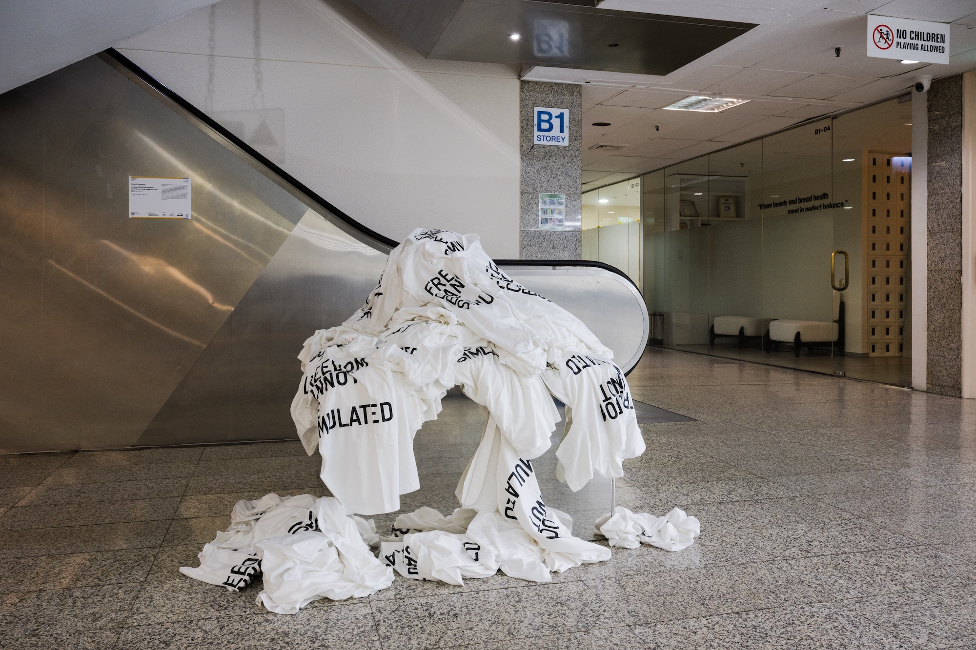 One of the works in the Singapore Biennale is a disposable pink plastic picnic-blanket printed with texts in multiple languages and available for purchase at four Burmese shops in the Peninsula Plaza shopping mall. You can’t exactly go to one of these stores with the intention of buying it, though; the idea is that the artworks are randomly inserted among the regular stocks of picnic sheets that migrant-worker communities from Myanmar purchase on Sundays when they gather, on their day off work, to share a meal in public spaces around City Hall and nearby Fort Canning Park. In doing so, they transform those public spaces into their private space (and highlight the lack of space afforded migrant workers in the city-state). The texts on the sheet are poems written by migrants, presumably to give them visibility as individuals and as artists – although organisations such as Migrant Writers of Singapore already exist to do this. Indeed, one of this last group’s volunteers, Julie annTabigne, has contributed a poem to the picnic sheet, titled ‘Rest Day’, which chronicles the excitement and sense of community that comes on these days, together with a sense of being part of Singapore rather than working for Singapore. The pattern here, as you might have guessed, is somewhat circular.
