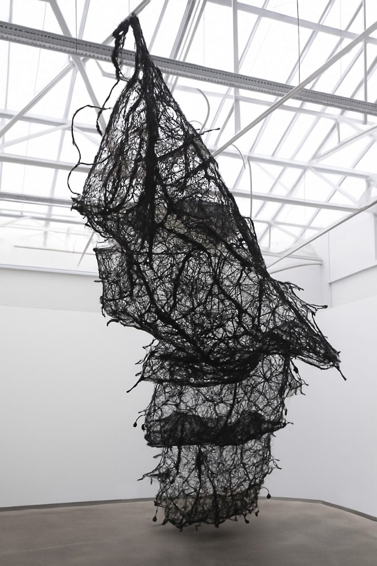 Charred hyphal mat, 2025, cotton rope, coir rope, jute rope, wood dust, thread, wood glue, fluid matte medium, acrylic, emulsion, fishing net, wood preservative and automotive enamel, 244 × 914 cm. Courtesy the artist and Experimenter, Kolkata