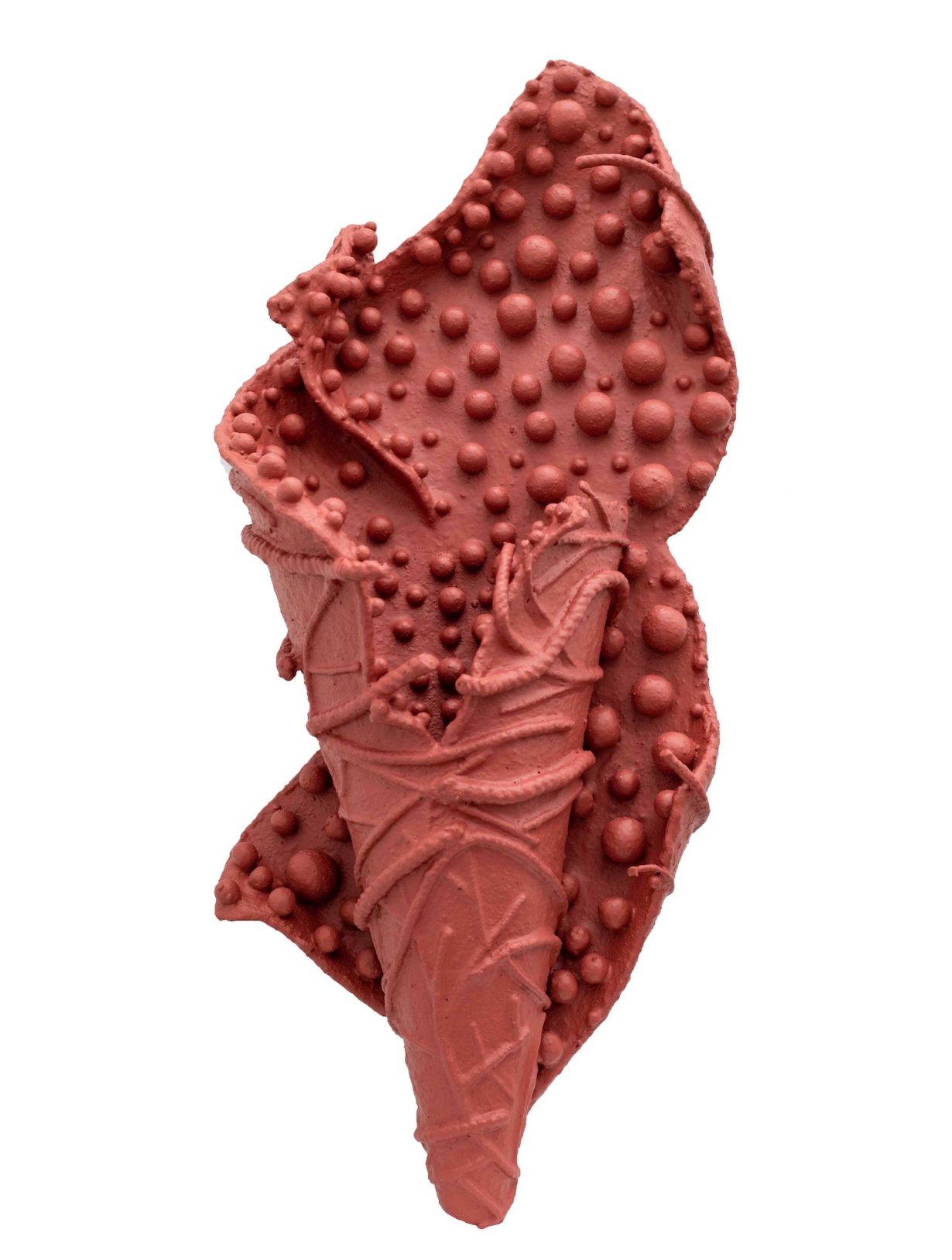 Wounded flowers, 2024–25, steel rod, hardware cloth, cotton rope, wood, dust, thread, wood glue, fluid matte medium, acrylic, emulsion, wood preservative and automotive enamel, 86 × 38 × 28 cm. Courtesy the artist and Experimenter, Kolkata
