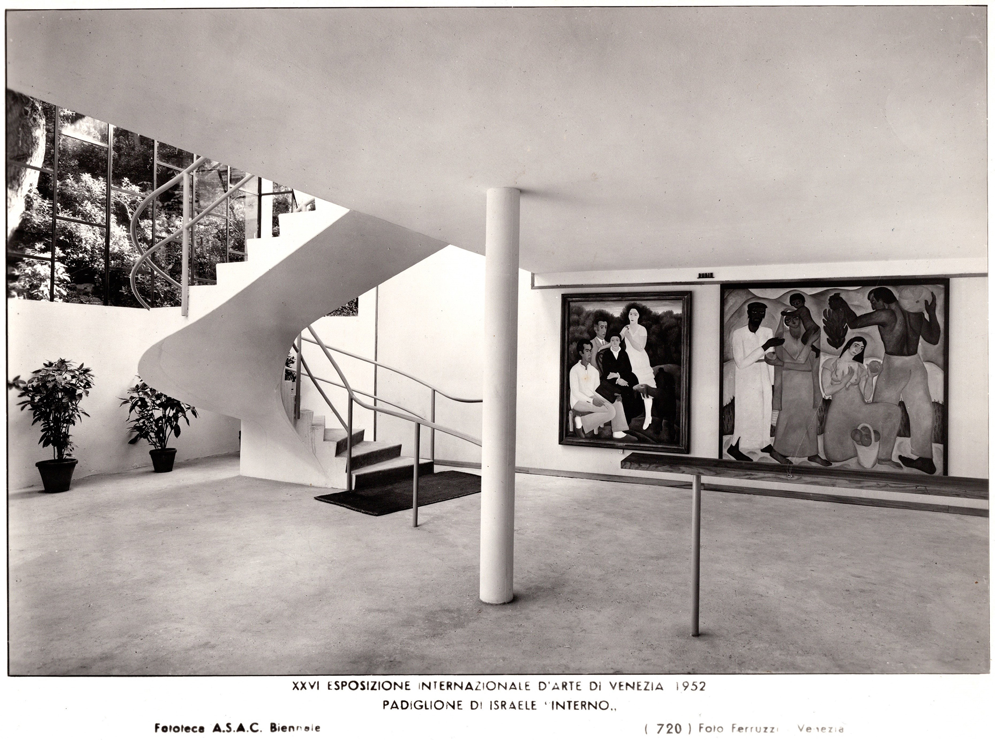 In 1948 the USA had a new neighbour in what was now the Giardini della Biennale. The State of Israel, declared as such that May, was invited to stage a show: originally the presentation was titled Artisti della Palestina (Artists of Palestine), organisers landing on Artisti Ebraici della Palestina (Hebrew Artists of Palestine), before agreeing to the final title Artisti di Erez Israel, Palestina (Artists of Eretz Israel, Palestine). The gardens were filling up and, over the following two decades, national participation more than doubled, with Venezuela (in 1954), Japan and Finland (1956) and Canada (1958) opening pavilions. Israel, barely three years old, got there first however, designing itself a permanent home, a pavilion in the International Style on a patch of land out the back of the US Pavilion. This opened in time for the 1952 edition of the Biennale with the work of artists Marcel Janco, Moshe Mokady and Reuven Rubin, the architecture advertising the new nation’s Western Europeanness and ‘civilised’ proclivities. A 1923 triptych by Rubin, titled First Fruits, opened the exhibition; except, as art historian Chelsea Haines has pointed out, only the central panel was shown, in which the Romanian-born painter depicts a Jewish family harvesting the bounty of the land. Missing from the show, we might assume for political reasons, were the flanking depictions of an Arab Palestinian shepherd and a Bedouin resting with his camel. In the catalogue to that edition of the Biennale, its secretary, Rodolfo Pallucchini, celebrated the addition of ‘extra-European’ nations to the event. Even today, the Israel Museum in Jerusalem, where Rubin’s work hangs, describes the Arab subjects in the two side panels as ‘essentially part of the landscape: secondary characters in this drama, they do not participate in the productive work that drives the world’.