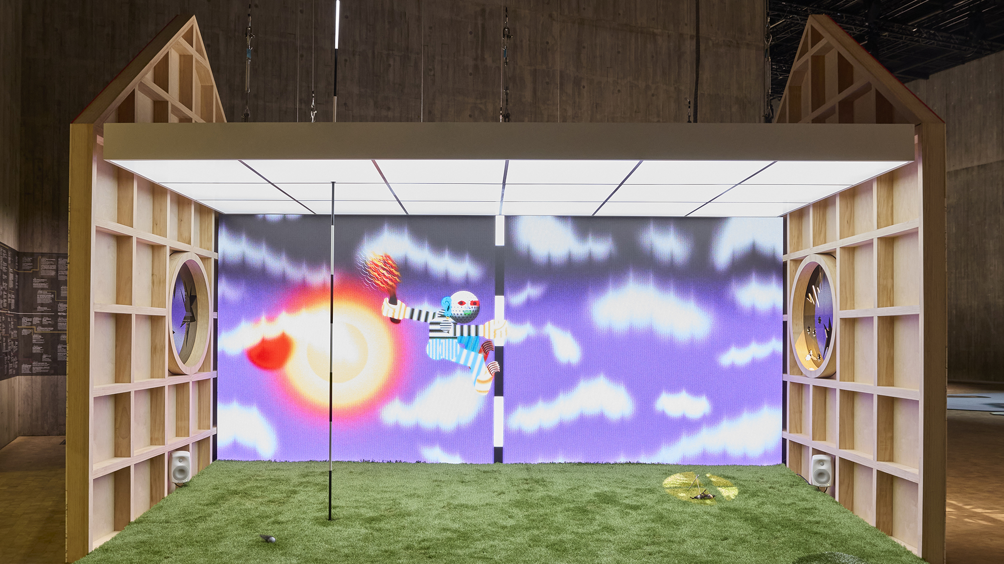 From the get-go it’s an eye-popping, sensorially engaging experience, compact and succinctly installed in a suite of rooms on Tate Liverpool’s airier top floor (the second time the prize show has fetched up in Liverpool since the Tate started touring the show fifteen years ago). Ecosystems are in your face as you enter the glowing purple-pink passageway that introduces Heather Phillipson’s installation Rupture No. 6: biting the blowtorched peach; ranks of flatscreens on either side, displaying the staring, blinking eyes of diverse beasts – slit-pupilled frogs who lick their own eyeballs, Siberian tigers, snakes and primates. Through this weirdly accusatory procession you enter a bigger space whose walls are flooded with video projections – of evolving cloud formations; of swans in flight; of a hot orange sunrise above a black sea, in which the sun appears to morph into a fiery peach. At the centre stands a corrugated iron rotunda, its door open to a sandy interior in which hang large metal gas cylinders, clanking balefully in the induced breeze. Outside stand two ridiculous revolving turbines, whose three arms have the shape of small ships’ anchors.