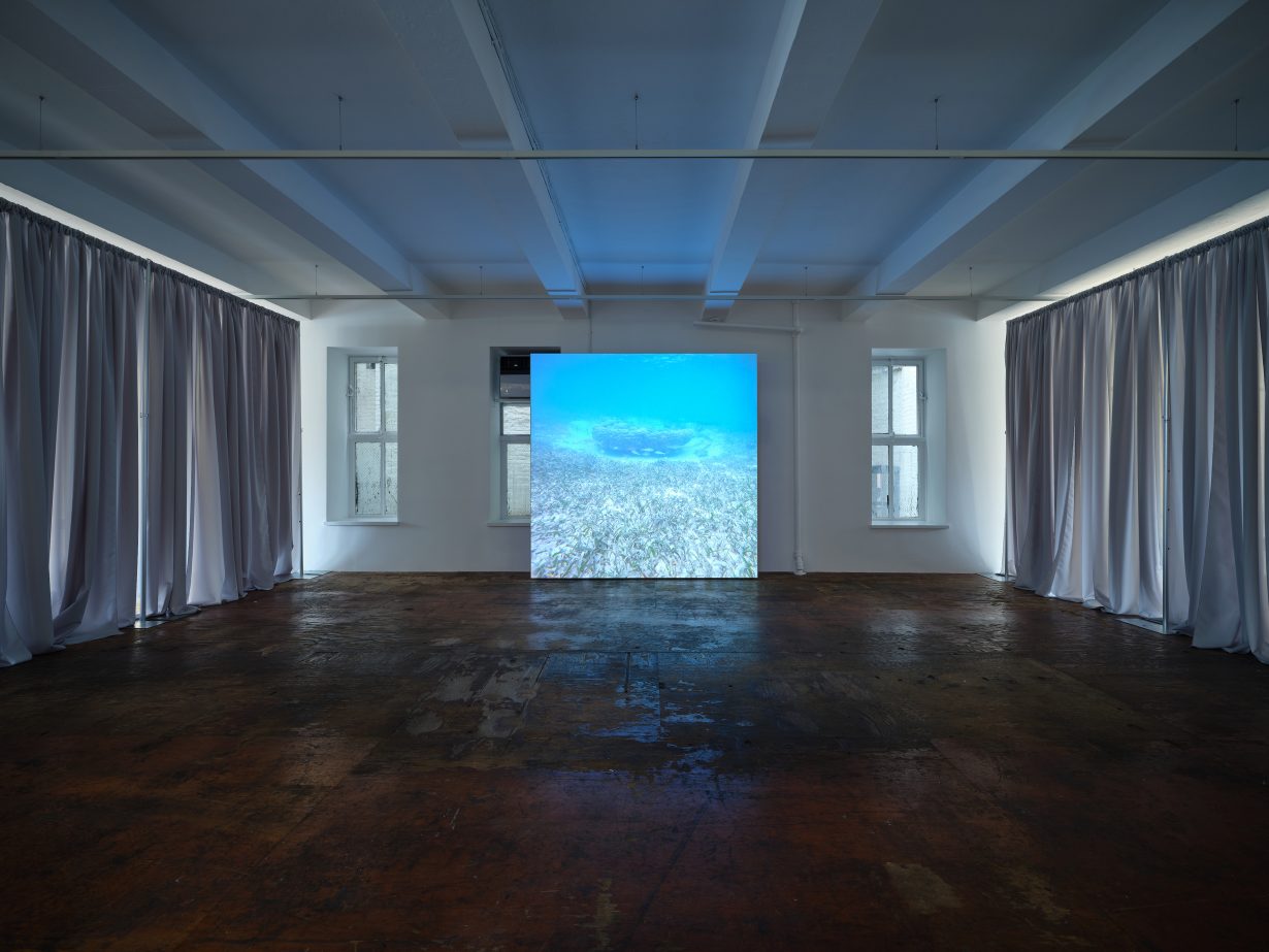 ‘The corals inspired us to work together,’ a school of blue fish seems to say. ‘No male asserts supremacy over the female,’ a yellow-tailed species is made to chime in. ‘Here in the lagoon being different is a given,’ a brown, squarish fish is conscripted to add. It comes as a relief when, as soon as a speech bubble pops up, the fish it’s imposed on darts away. While these statements may, in a sense, be true, they read as overly simplistic and morally convenient, as if written to prove the natural occurrence of a particular human value-system that the artist wants to support. At worst, the proclamations are infantilising in tone: ‘Some say I’m territorial / Because I’m a farmer! / I cultivate red algae / I work hard / And my land is tiny.’ Why must this evidently complex world be reduced to story-book narratives? The fact that the artist enlisted ChatGPT to complete this script only underlines its tendency towards flattening statements.